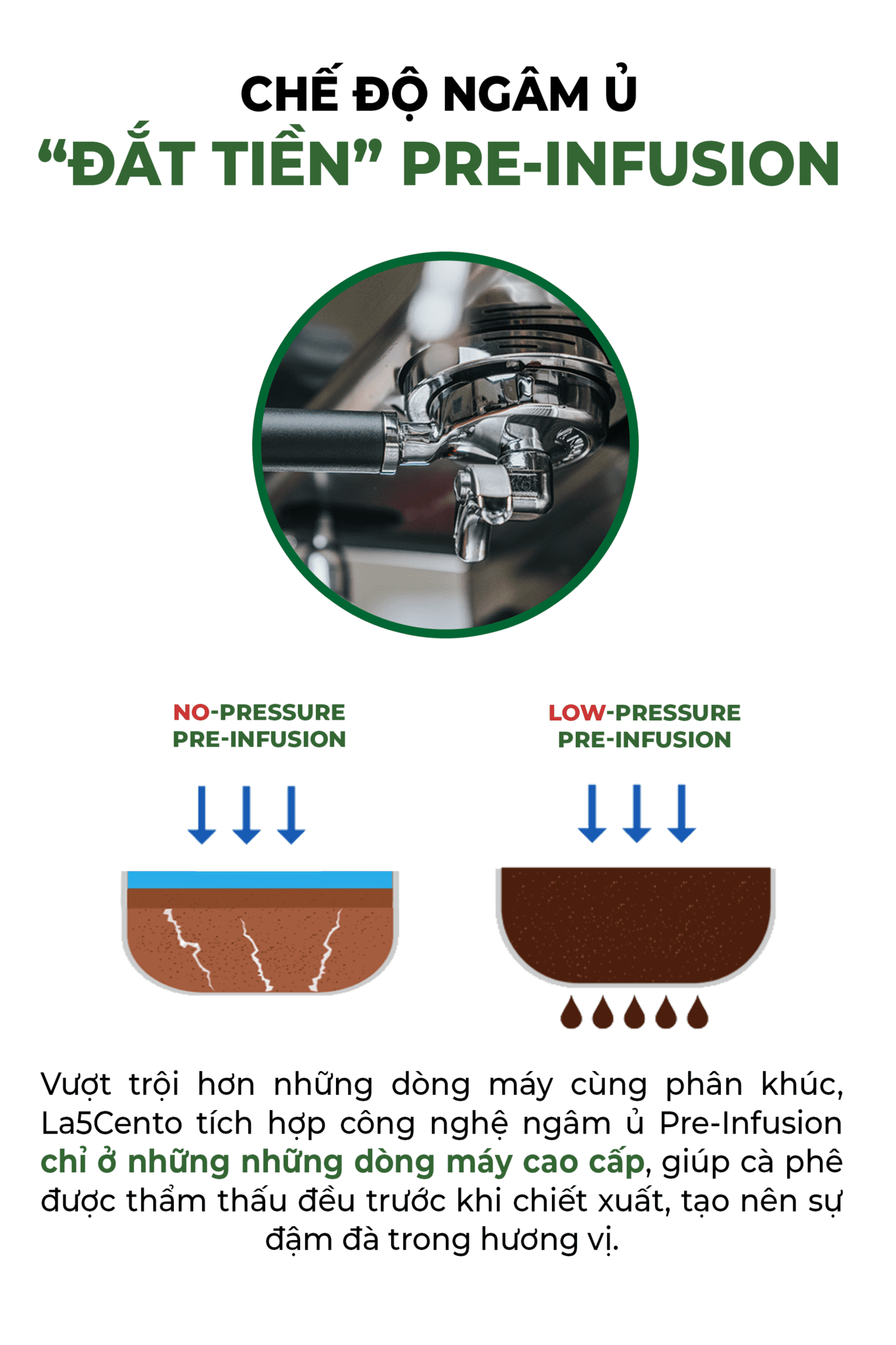 Hệ thống nồi hơi lớn và bơm cơ giúp áp suất và nhiệt độ ổn định, cho espresso đậm vị, lớp crema dày.