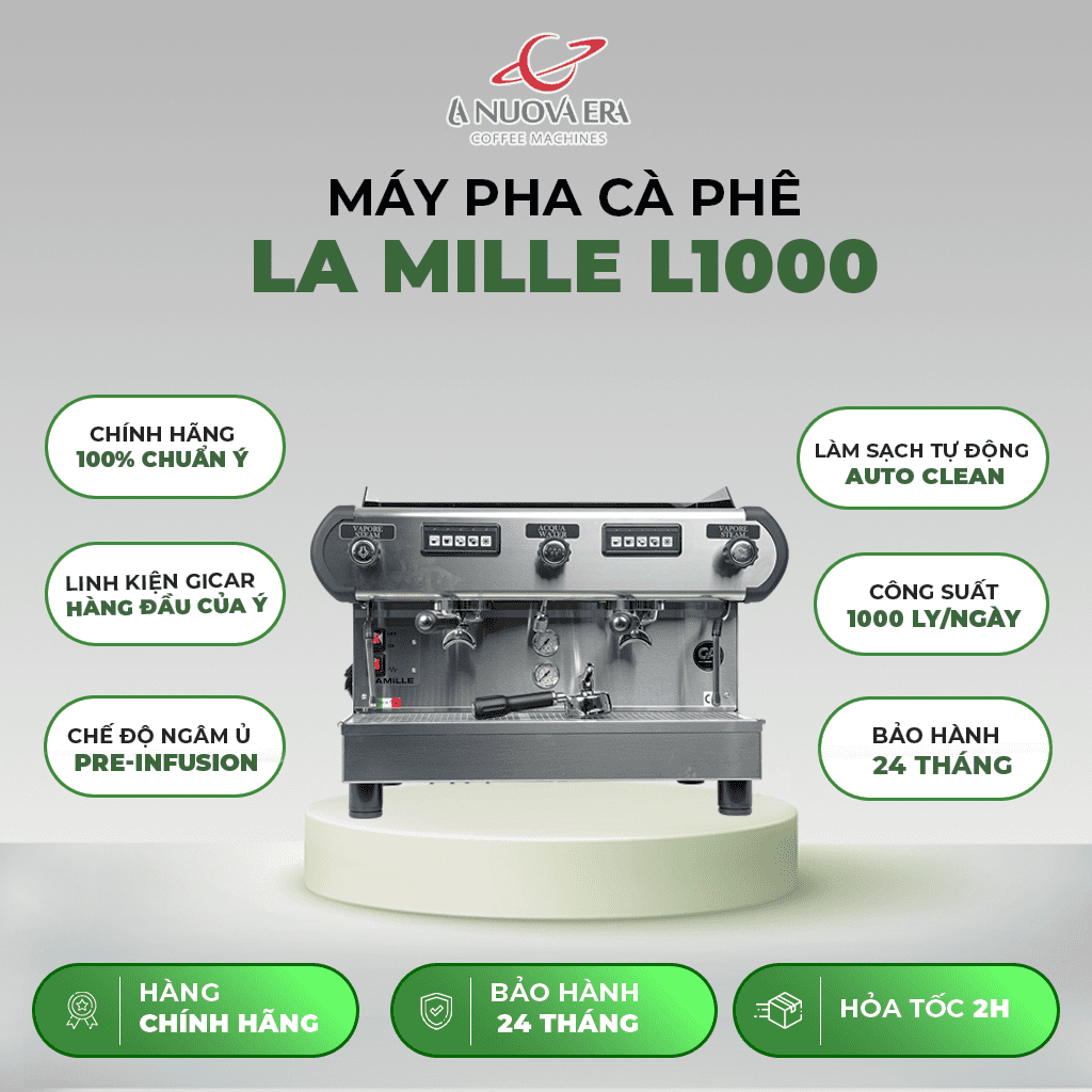 La Nuova Era là thương hiệu máy pha cà phê danh tiếng của Ý, nổi tiếng với thiết kế cổ điển, chất lượng linh kiện cao cấp và hiệu suất bền bỉ. La Mille (L1000) 2 Group là lựa chọn lý tưởng cho quán cà phê, nhà hàng, khách sạn cần phục vụ liên tục trong giờ cao điểm mà vẫn đảm bảo hương vị espresso đồng đều.